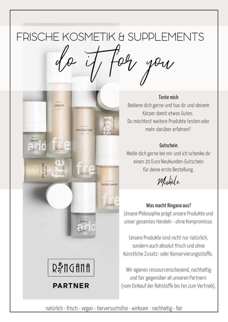 Ich bin Partnerin von Ringana, weil ich die Produkte wirklich schätze und von ihrer Qualität überzeugt bin. Es geht nicht nur um den Verkauf; es geht darum, Menschen die Möglichkeit zu geben, sich für frische, natürliche und nachhaltige Produkte zu entscheiden. Bei Ringana bekommst du nicht nur hochwertige Hautpflege und Nahrungsergänzungsmittel, sondern auch die Gewissheit, dass du etwas Gutes für dich und unseren Planeten tust.
